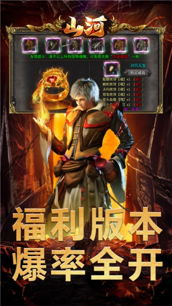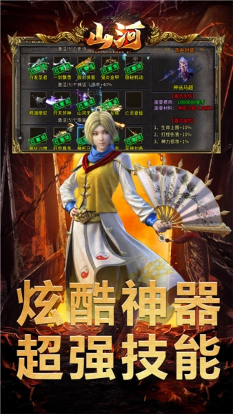山河官方版是一款拥有超大规模的魔幻传奇游戏,游戏中的故事情节紧扣历史背景和文化特点,玩家将在游戏中体验到古代中国的风土人情和战争氛围。游戏中的地图、建筑、服饰、武器等都栩栩如生地展现了古代中国的面貌。游戏中还有各种有趣的玩法,如剧情任务、野外挂机、世界BOSS、帮派争霸等等。
