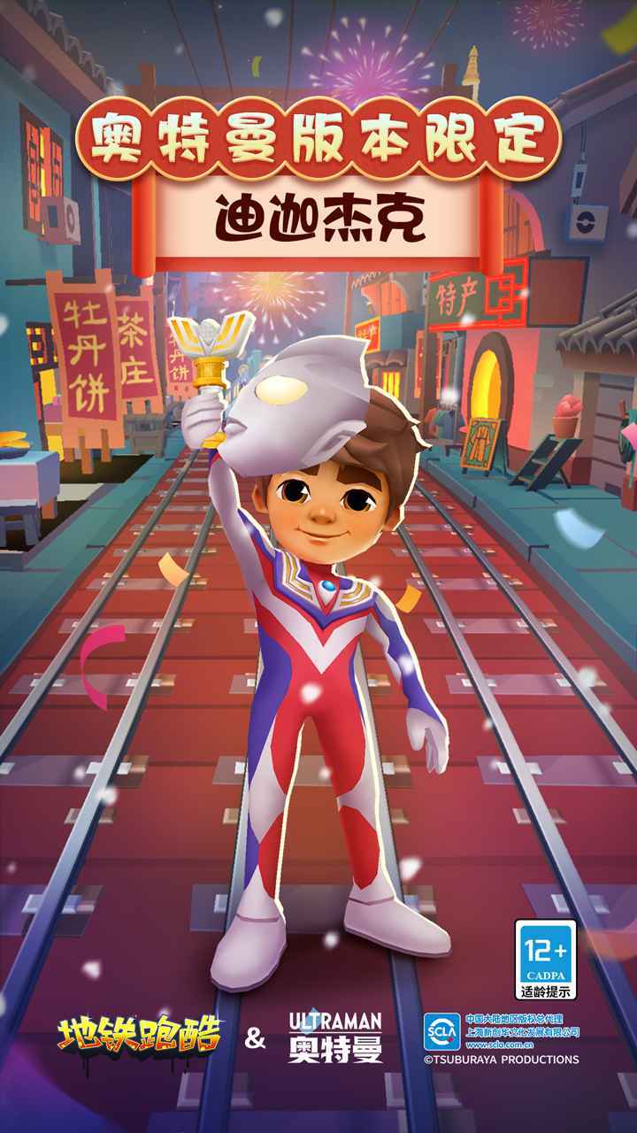 奥特曼战士和外星人降临地铁大院,「迪迦杰克」乘载新滑板「胜利飞燕」,使用新背饰「神光棒」变身,将与「巴尔坦杰克」比试跑酷的真实力。