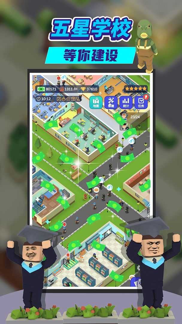 3、游戏中扮演校董的角色,一心拉投资搞建设,不断拓展学校的师资力量。吸引学生前来报道上课,让学生安心学习。