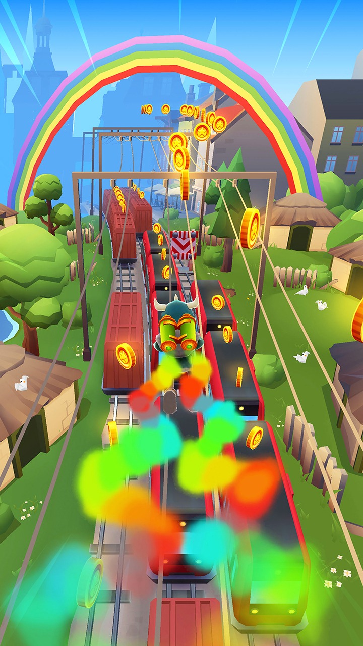 玩家经常遇到的一种情况。左右两路没有任何障碍,中路有5~6辆火车奔过来。为了能够把车上的金币吸收干净,这个时候就可以运用基础组合跳滚了,前提是不要玩得太很,稳一些较好,如果火车还没到达玩家下方,玩家就已经在半空中往下划那么就只有死翘翘了。