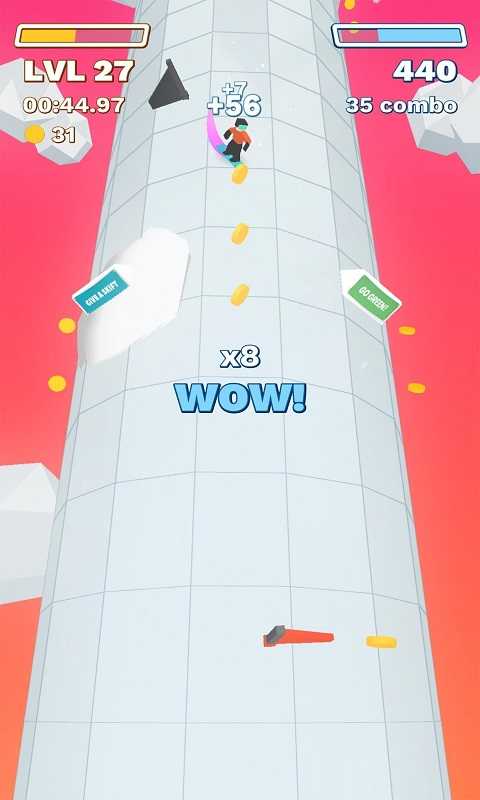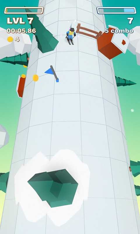 你可以自己控制下降的速度,通过左右滑动来增加滑行距离并且控制住速度。在无尽漫长的粉末雪滑道上,尽情呼啸滑行吧;没有关卡没有终点,无尽的下滑;利用重力感应操作