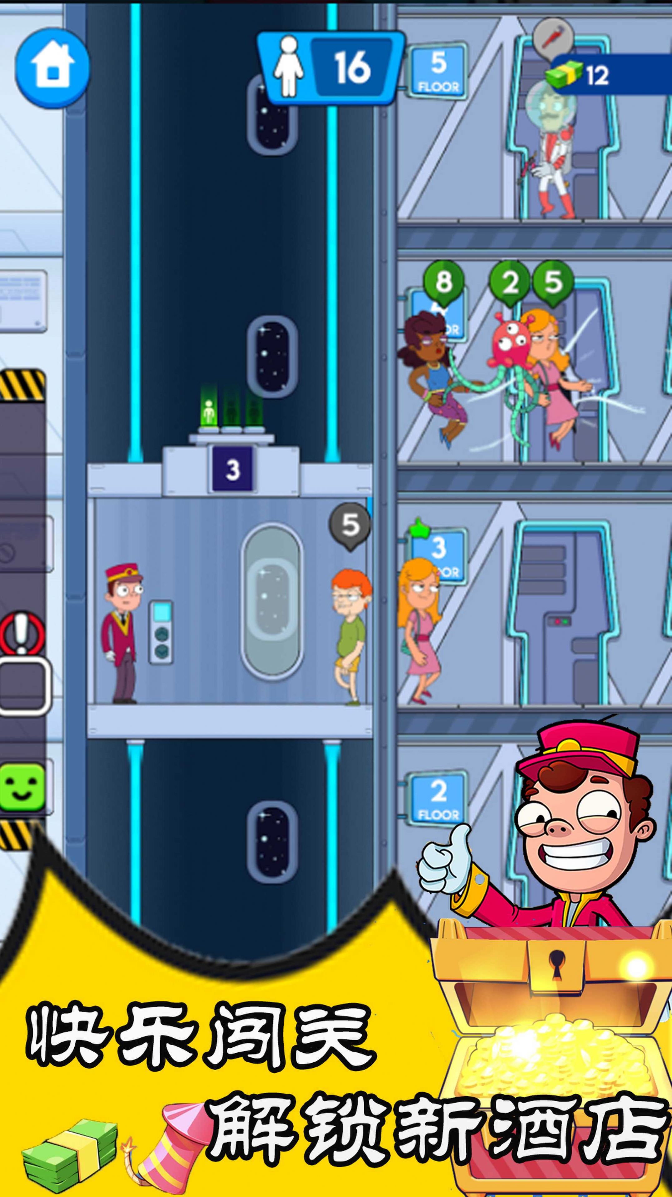 2、很多的关卡,欢快的氛围,你可以一个个的来闯关,解锁出新酒店。