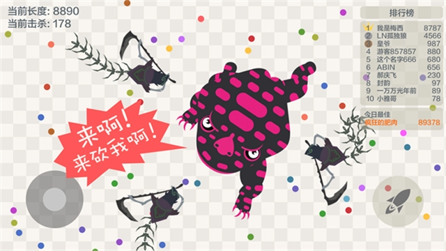 2、同时需要躲避其他玩家控制的小蛇,避免被撞到,减少生命值。
