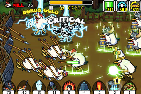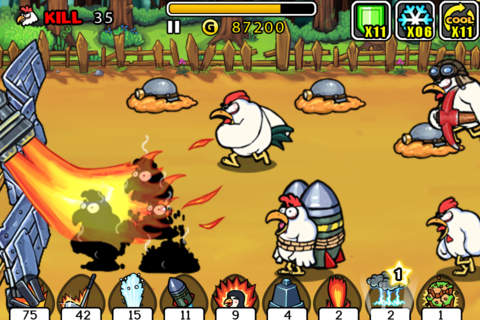 2.红色按钮是操控玩家扮演的铁公鸡移动的方向的,黄色按钮是角色的基本公鸡,蓝色是角色的技能攻击。蓝色的技能还是非常强大的。只见瞄准好敌人以后,按下蓝色技能键只见立马屏幕上出现了好多的类似于箭头一样的东西,射向你的敌人。