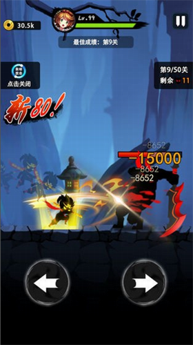 十分简单的操作玩法,使用两个虚拟按键可以同时进行攻击和移动。