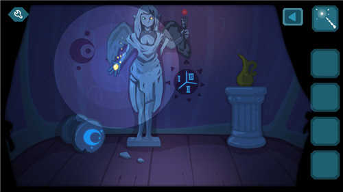 用蜡笔把墙上的那个紫色图形擦除,露出钥匙孔,把钥匙插进去。然后就会露出一个如上面所示的图形。里面需要镶嵌三个物体,旁边的圆盘需要三个数字。