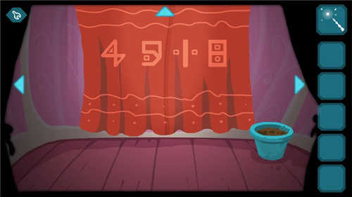 来到上面的这个场景,把熟肉放到盘子里,旁边的狗就会张开嘴巴,可以得到一把钥匙。同时注意到墙上的图案,按照前面的推测方式,我们可以得出密码:4516。