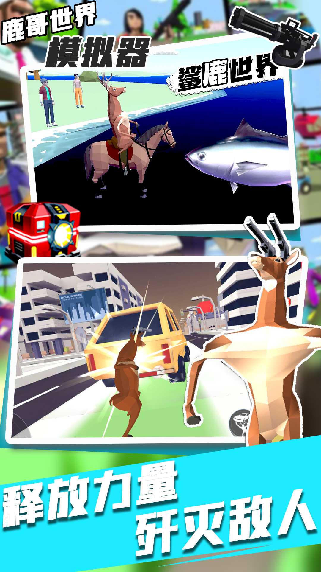 鹿哥世界模拟器是一个自由度极高的沙雕鹿主题城市动作冒险类游戏,其中的可操作性极强,也能展现更加疯狂的破坏玩法。开放沙盒的游戏世界之中,玩家可以帮助沙雕鹿不断装备强大的火力,还能解锁更为强力的超级装备,3D卡通世界的激情冒险,随时开启,玩家能够尽情开启其中的激情对抗。