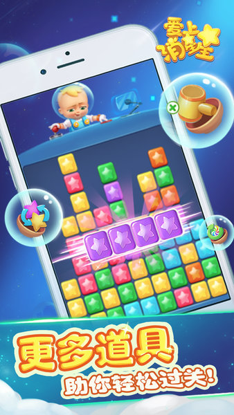 爱上消星星是一款非常经典的手机游戏,也是一款非常容易上瘾的消除类游戏。星星以不同的颜色和形状出现在游戏界面上,游戏中还有一些特殊道具和技能,可以帮助玩家更快地消除星星和获得更高的分数。玩家可以根据自己的策略和技巧,选择合适的道具来提高游戏的效率和乐趣,喜欢的小伙伴来试试看吧。