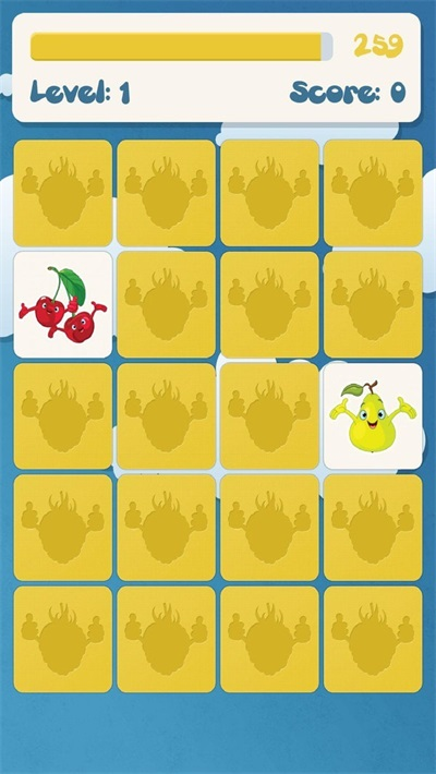 1、操作简单,使用方便。点击卡片,打开卡片记忆卡的水果,消除同一张卡片对应的水果。