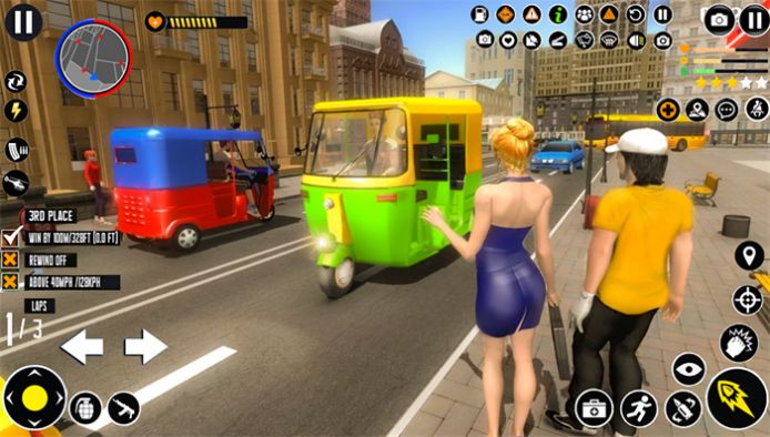 1、通过操作自动人力车,穿过印度繁华市区的复杂道路和人群,赚取积分并完成各项任务;