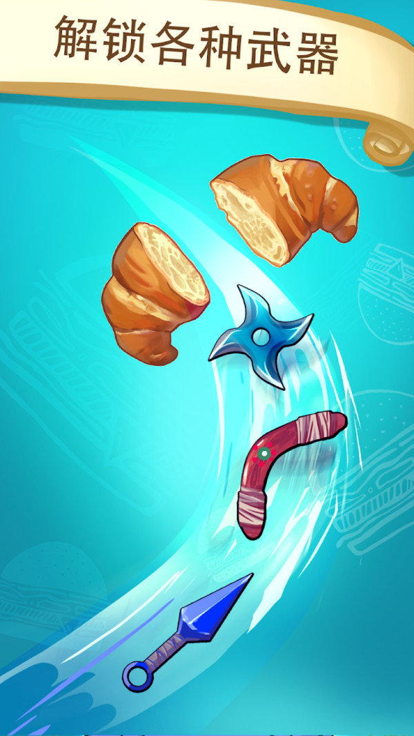 3、玩家需要使用武器将食物切成小块。游戏中有大量的武器,玩家可以自由选择。