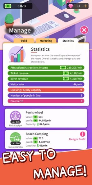 3、超多趣味的项目可以解锁,吸引各种的顾客,在这里消费获取收益。