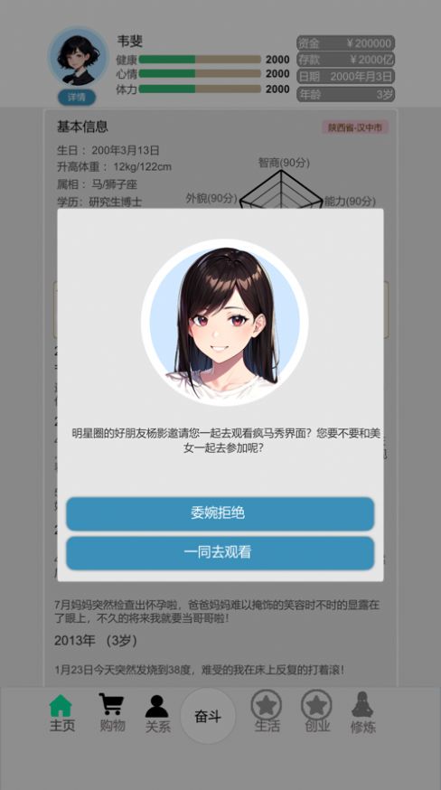 2、模拟经营养成人生游戏,体验从小学生到老年人的完整人生经历;