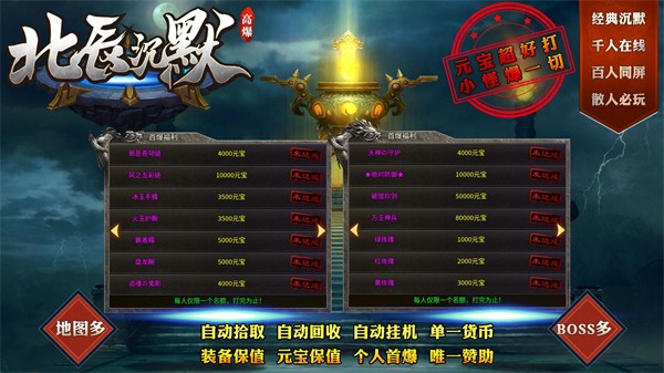 北辰沉默传奇是一款大型的高爆率专属沉默传奇,开局直接免费送首充,还有帅气坐骑等你选择,真金白银线上交易,所有装备都很保值。经典打怪升级的基础玩法,也会为玩家解锁自动拾取的功能,让你迅速的体验其中的丰富挑战。还有强力散人职业解锁,硬核的服务器,可容纳数百位玩家同台竞技。