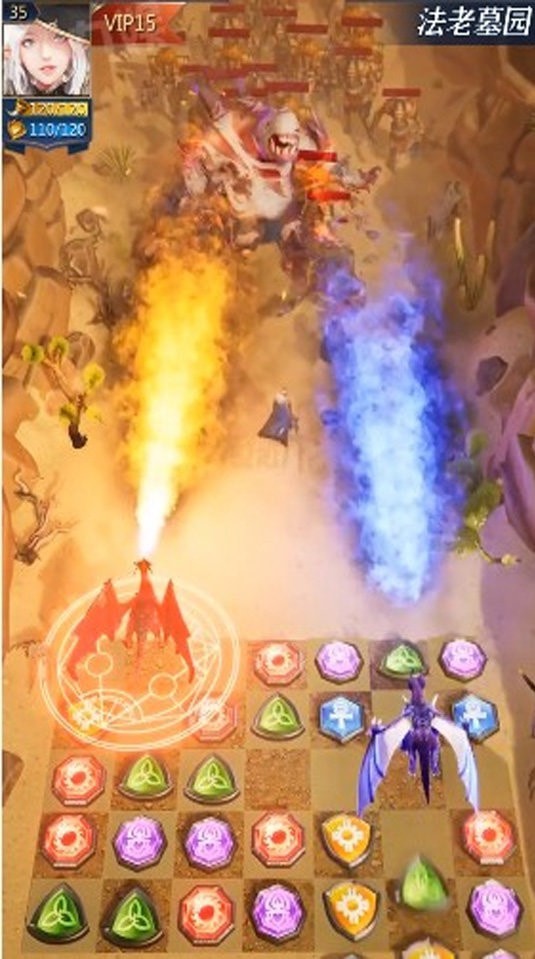 3、三个一样的宝石可以消除,消除之后就能发动攻击,消除数量越多,攻击越高!