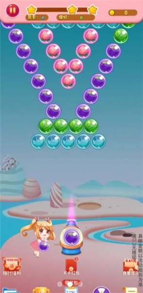 2、全新的闯关模式,消除泡泡时的华丽特效,可爱动听的游戏音效,给玩家呈现的是美轮美奂的游戏画面,轻松有趣的关卡简单好上手,让玩家能更快速的赚取收益,快速的领取到红包。