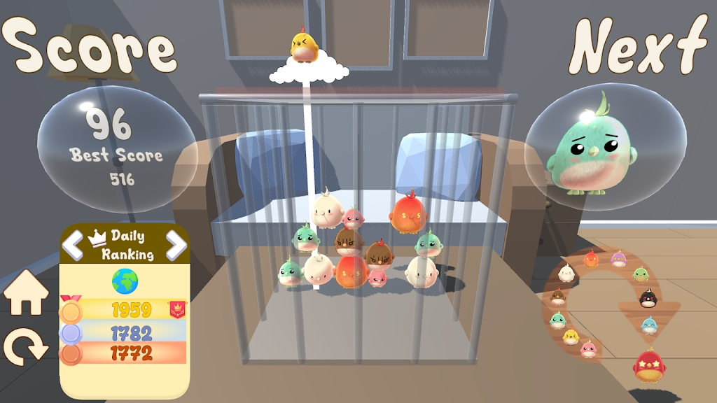 并尽可能的创造新的鸟种,通过不断的成长可爱小鸟的数量,来获得更高的分数和等级。