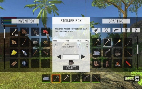 2.寻找各种食物,收集不同的资源制作武器,你需要更多的武器装备帮助自己更好的存伙下去;