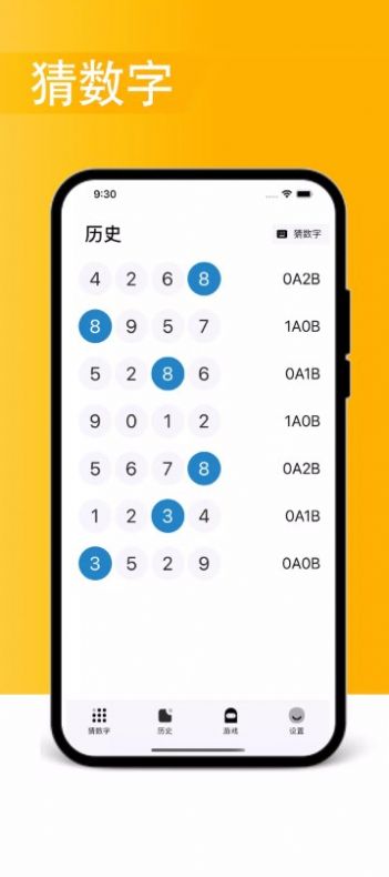 1A2B猜数字这款游戏主要是休闲闯关的类型,游戏考验的主要是玩家的脑力,需要尽情的发挥,提供的题目还是很多的,前期会简单不少,给你一个适应的阶段,后面的难度就会提升,玩起来更有挑战性。