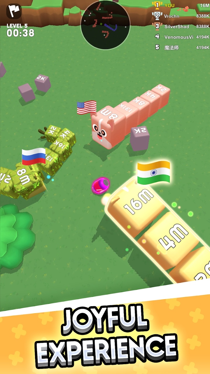 贪吃蛇2048竞技场采用创新玩法主题的一个贪吃蛇2048吞噬进化的小游戏,以卡通方块的精致画面塑造而成,也会通过3D视角的操作,让玩家自由展开贪吃蛇的刺激竞技对决,更多疯狂的即时战斗以及多彩的挑战模式,可以让每一个玩家自由参与其中,而且创新的2048玩法设定,可以帮助玩家的贪吃蛇更快进化哦。