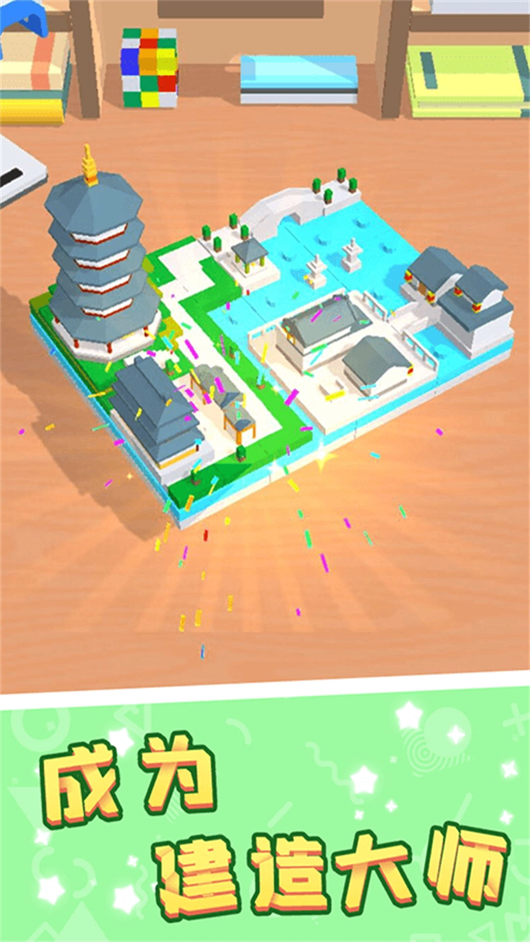 1、使用各种形状的积木拼凑你的建筑,创作出的作品将被永久保存;