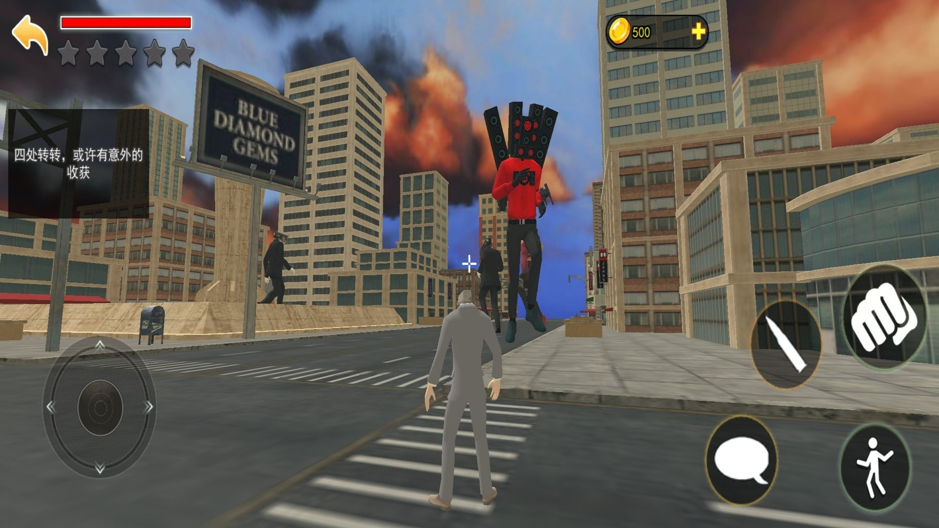 2、利用环境中的障碍物和场景,精准地攻击巨型马桶人,保卫城市;