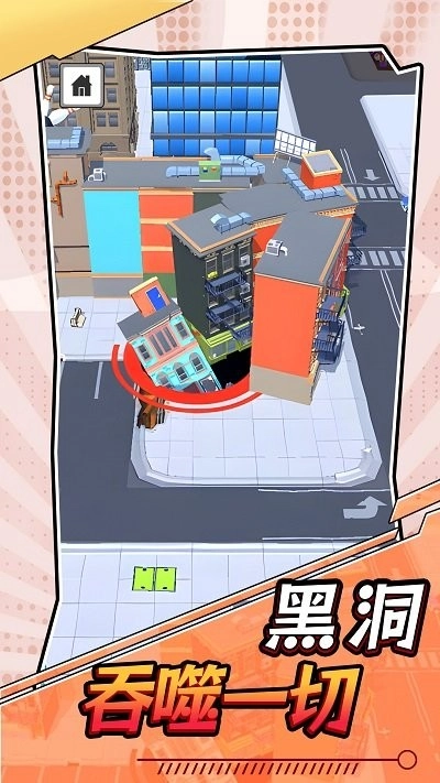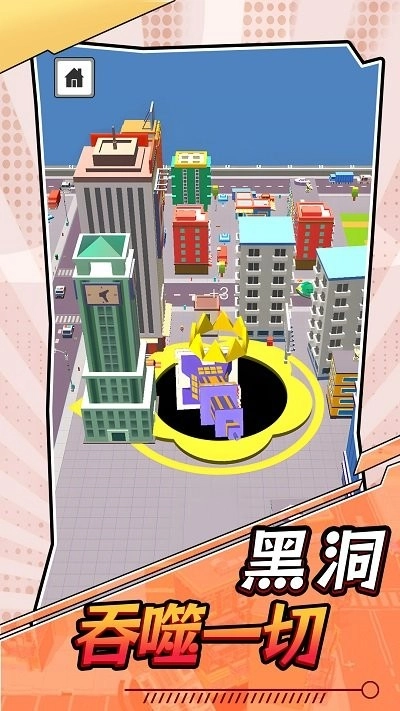 1、创新黑洞操控玩法:玩家扮演黑洞,通过移动吞噬场景中的物体不断扩大自身;