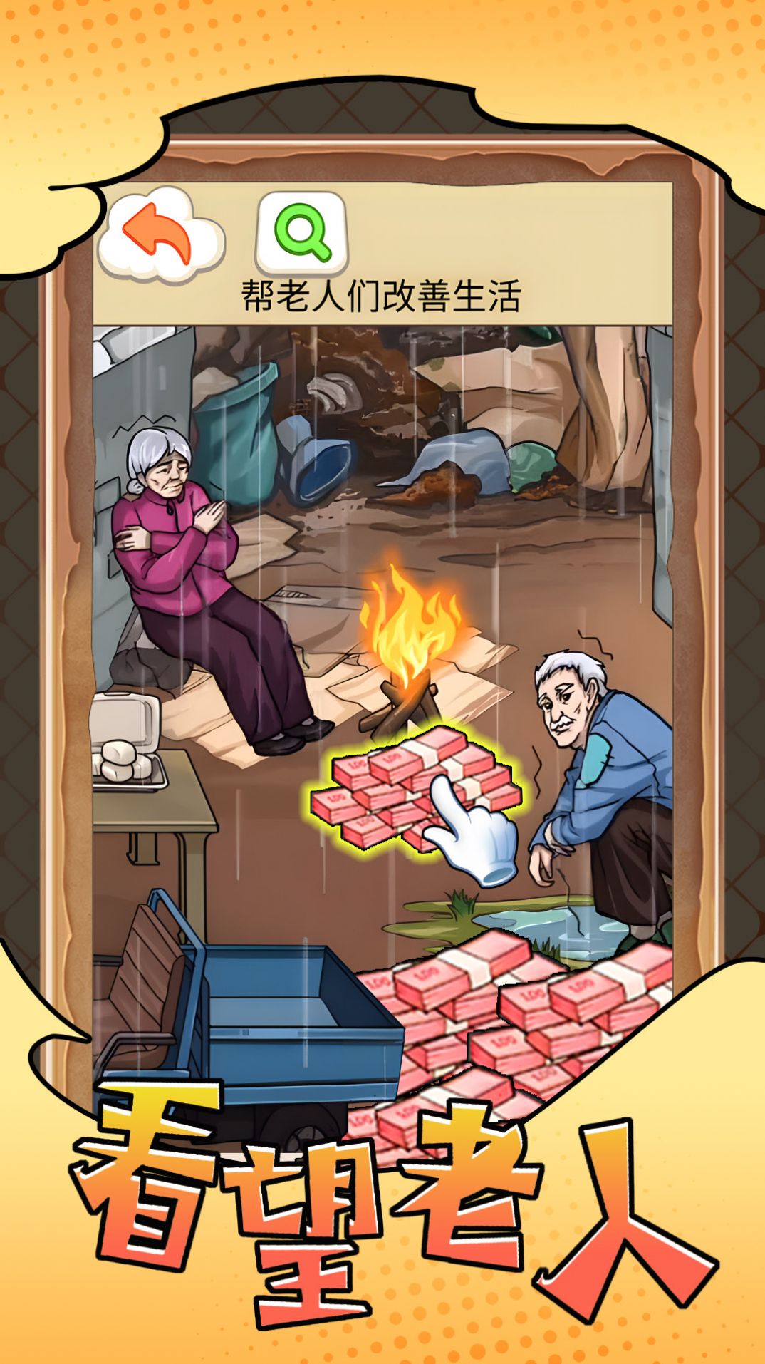 1、每一个场景设置的难题都不同,通过花钱帮助孤寡老人改善生活;