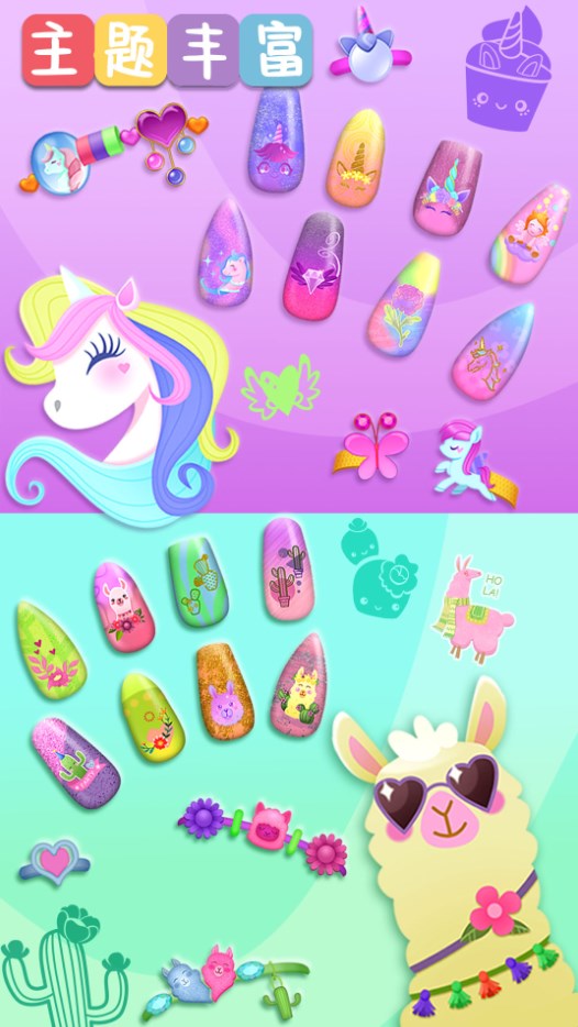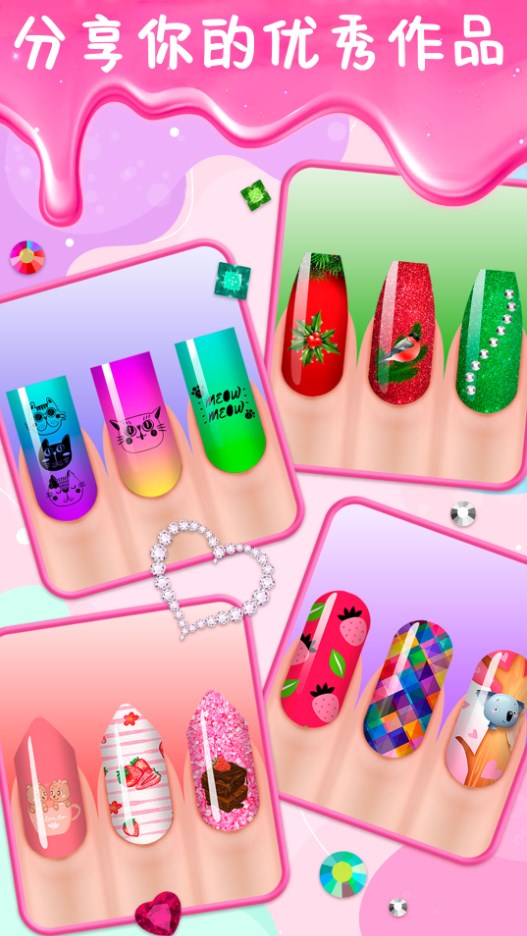 1、为时尚爱美丽的小女孩们设计最好的美甲吧,提高自己的技巧,完成意想不到的美妆美甲搭配。