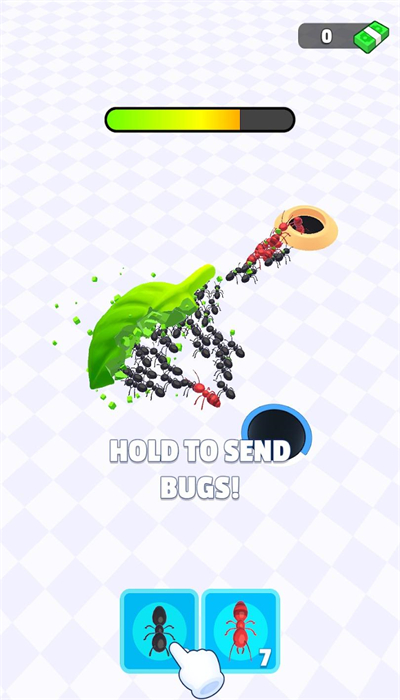 1、探索广阔洞穴地图,搜集食物资源以满足巢穴需求,解锁更多昆虫种类及关卡;