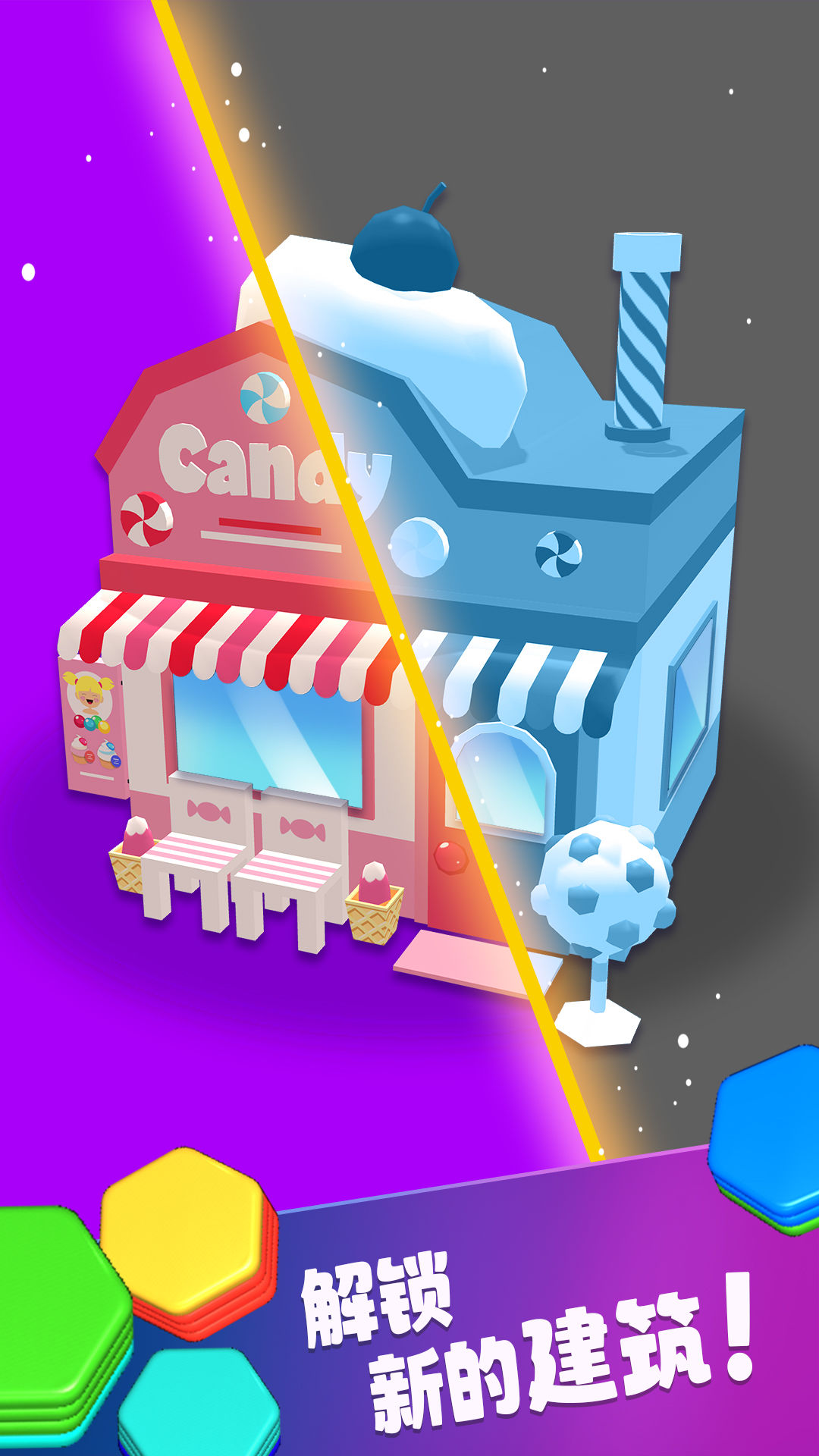 1、独特的六边形叠加消除玩法,增加游戏的可玩性和娱乐性;