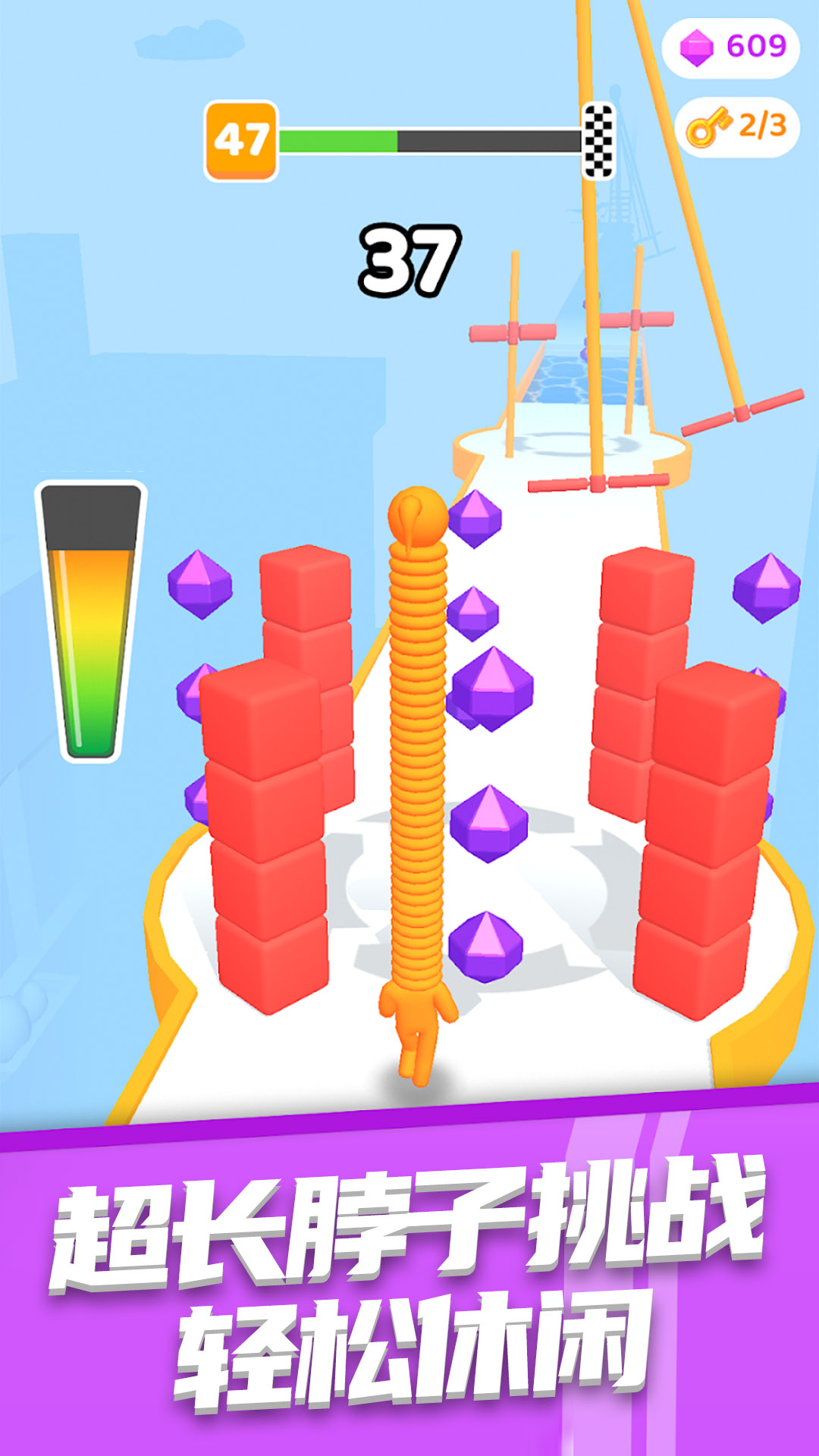 高个子赛跑每个关卡都有独特的地图布局和障碍设置,玩家需要不断适应新环境,收集不同颜色项圈不仅能使脖子变长,还可能激活特殊能力或加分效果,例如红色项圈可能暂时增加速度、蓝色项链提供护盾防御一次撞击等。