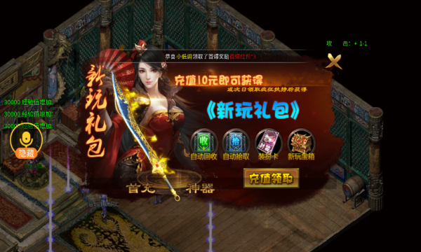 3、上线满攻速,自动回收,自动拾取,装备无绑定,元宝全靠打。
