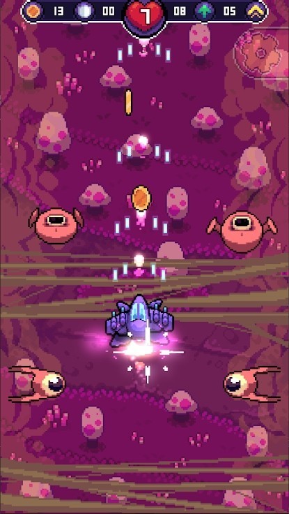 3.每一个关卡当中都有着大量的道具可以拾取使用,帮助你改变战机的子弹形状和威力。