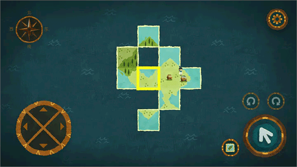 不同的地图世界里暗藏玄机,隐秘之处可能就是地图碎片散布之处。观察这些地图后,卡朵就可以依赖自己的能力,将地图旋转,首尾相接,连成一片新大陆。这片大陆没有指定的方向,只有卡朵自己用手将这些碎片连起,方可到达彼方。