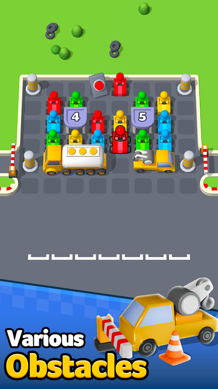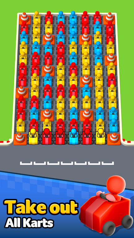 1.拖动消除:通过拖动卡丁车,消除相同颜色的车辆;