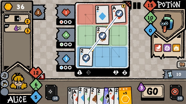 最底层是防御行动栏,其对应的花色为方块。当方块卡牌放置到该区域时,数值会增加,增加的数值等同于方块的等级。