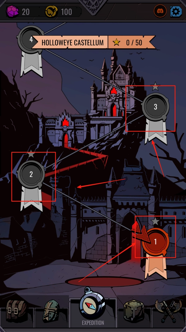 1. 顶部呈现20紫宝石与100金币,中部是HOLLOWEYE CASTELLUM横幅及0/50的进度条,还有披风老者在进行对话,底部设有橙色按钮与功能图标。