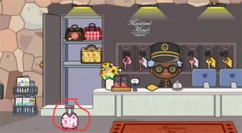 8、于酒店一楼打开保安身后的柜子,能够发现一个可爱的粉色猫咪造型行李箱,这可是出门旅行的必备好物。