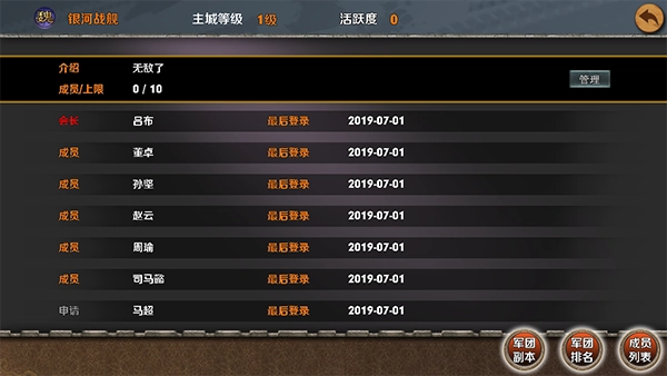 在成员列表里,能够查看本军团的基本信息,包括军团名、军团介绍、军团长、军团成员、军团等级以及活跃度等。