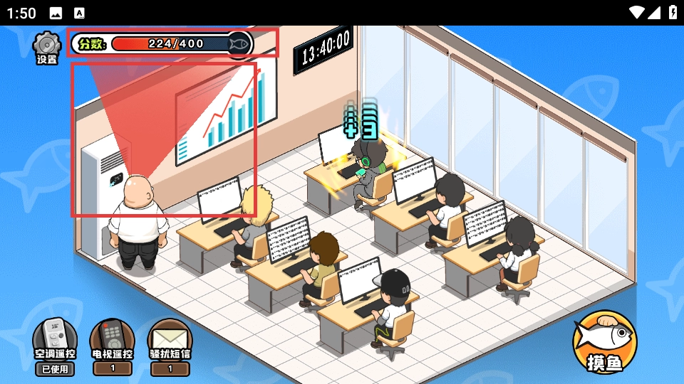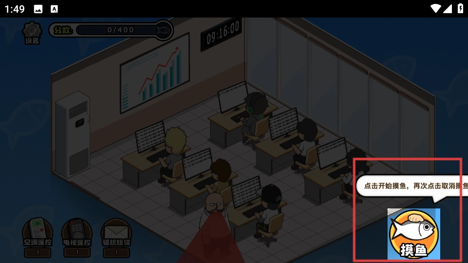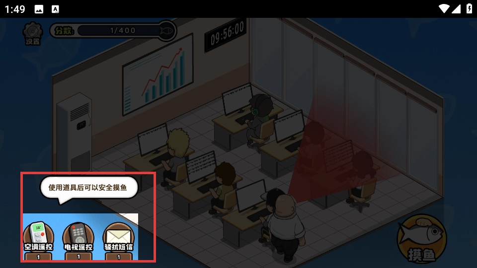 3、利用左侧的【空调遥控】【电视遥控】等道具,确保摸鱼过程的安全性。