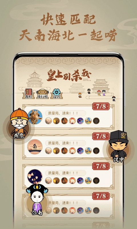 《皇上别杀我》是一款超有趣的休闲益智游戏。它以古代剧情为主线,玩家在游戏中扮演角色,玩法类似狼人杀。感兴趣的小伙伴不妨来体验一番,喜欢这类游戏的玩家千万别错过,赶快行动吧!