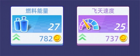 6、当然啦,刚开始就想跑到满分是不太现实的。但咱们可以利用过关得到的金币,来提升燃料的能量,让飞天速度变得更快哟!