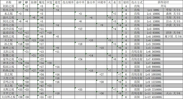 开罗之杖:在通过火山关卡6后即可获赠。相较于龙之杖与骷髅之杖,它所增加的魔攻数值更高,角色持有时行走速度较快,但魔法回复速度较慢。其回避率的作用不大,尤其当人物等级较低时,可能射出一梭子魔法后就耗尽魔力,且回复缓慢,因此不太建议前期使用。不过,开罗之杖具有免费获取且移动速度快的优势,到了游戏后期,玩家可以借助它来实现快速通关。