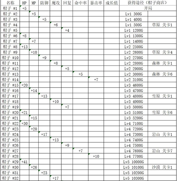 帽子(其中均不涉及加速度、攻击频率、回避率以及火、水、雷相关属性,仅统计部分成长数值。)