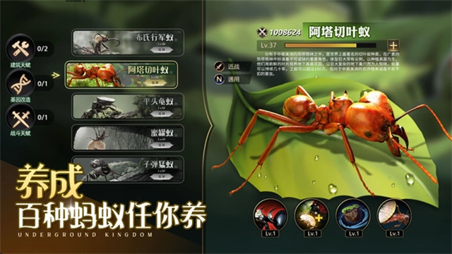 想要掠夺资源、扩张领土,就一定要打造一支强大的蚂蚁军团。除了大量的高级士兵蚂蚁,你还得为自己的蚂蚁部队安排领导者——特殊蚂蚁。你能够通过孵化突变蛋,从而得到强大的特殊蚂蚁。当你的蚂蚁部队将士兵蚂蚁与特殊蚂蚁进行合理搭配,就能取得全面胜利。