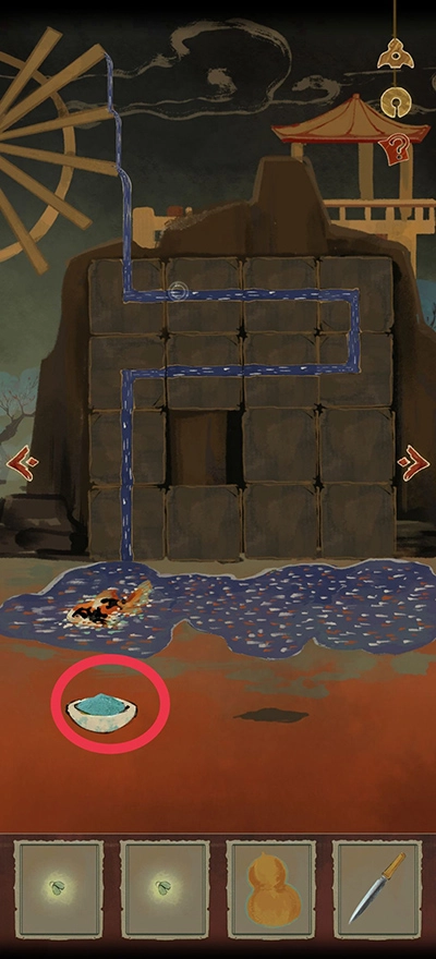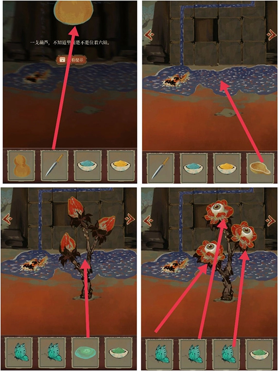 5、接着,把种子种进拔出匕首后形成的坑里。随后,用匕首将葫芦劈开,从中舀水,给种下的种子浇水。浇完水后,再用玉石对其进行催化。做完这些,把蝴蝶放置在花朵上,让它传粉(?)。神奇的是,届时会飞出来一只鸟,它会把鱼叼走,最终只会留下一个盒子。