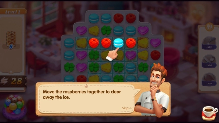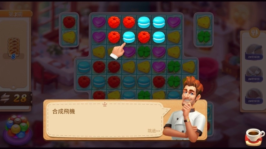 3、所有的食物材料都需要在厨房进行三消游戏来获得给游戏充满了奇妙的感受。