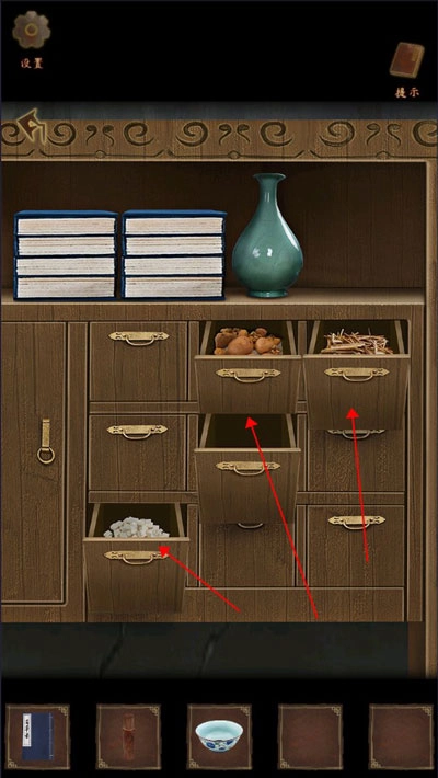 4、轻点药柜,把所有柜子都打开,于正中央的柜子中获取【火折子】与【空碗】